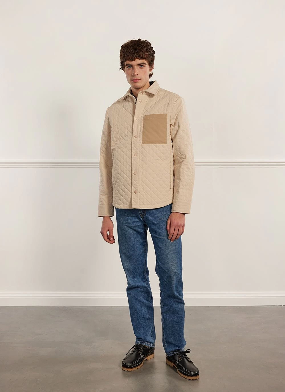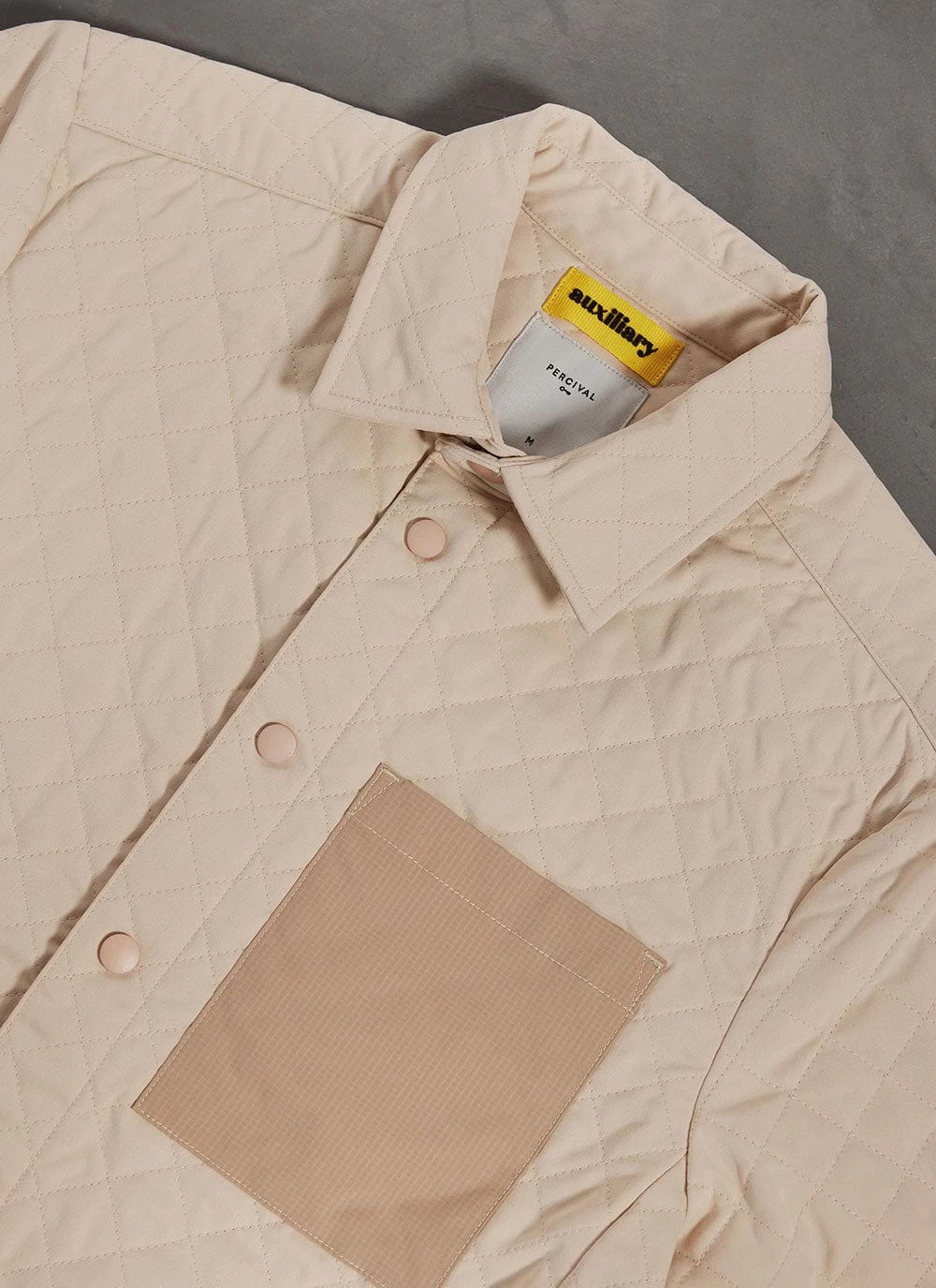 Your routine is critical, no matter how different, how complex, how simple. Percival Auxiliary is a collection relevant to your every day habits regardless of what they are. These garments are the building blocks of every outfit for everyday. Part of this outfit, a designer menswear quilted shirt, an overshirt, in a lightweight but warm box quilt fabric, perfect for laying, perfect for the commute, perfect for the every day.