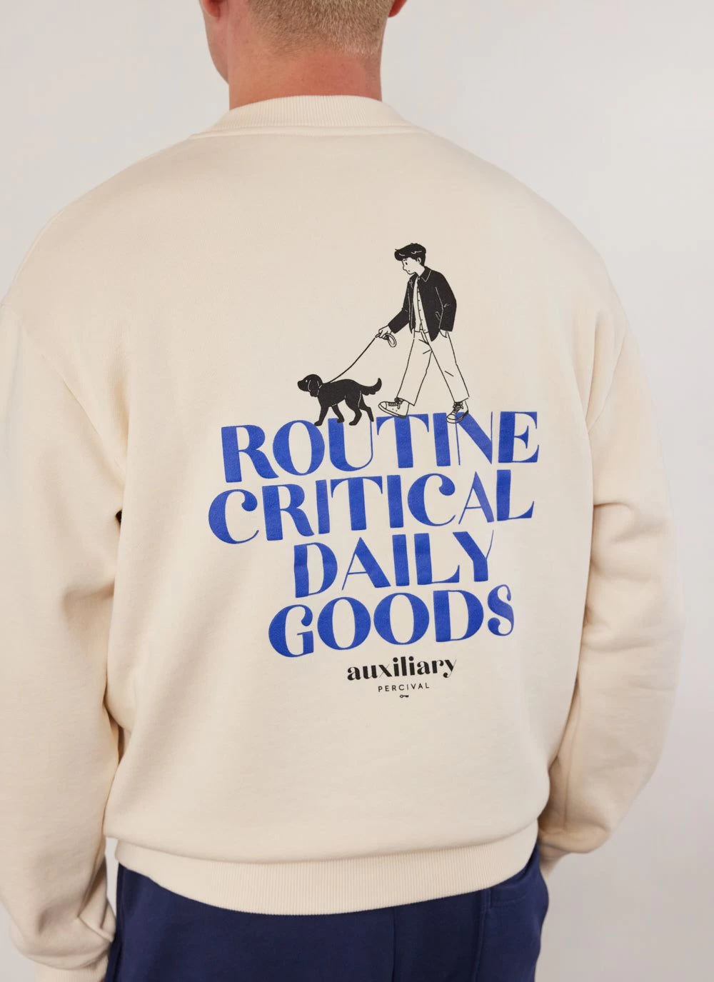 Percival Auxiliary part of the building blocks of every outfit of every day. Heavy weight crew neck sweat with dog walk print. What do I and many others do on the daily? Walk the dog. Not the yoyo trick. BCI 100% cotton heavy weight jersey goodness, made in Portugal hoody, embroidery at chest with puff print on back. Good for daily dog walking wear.