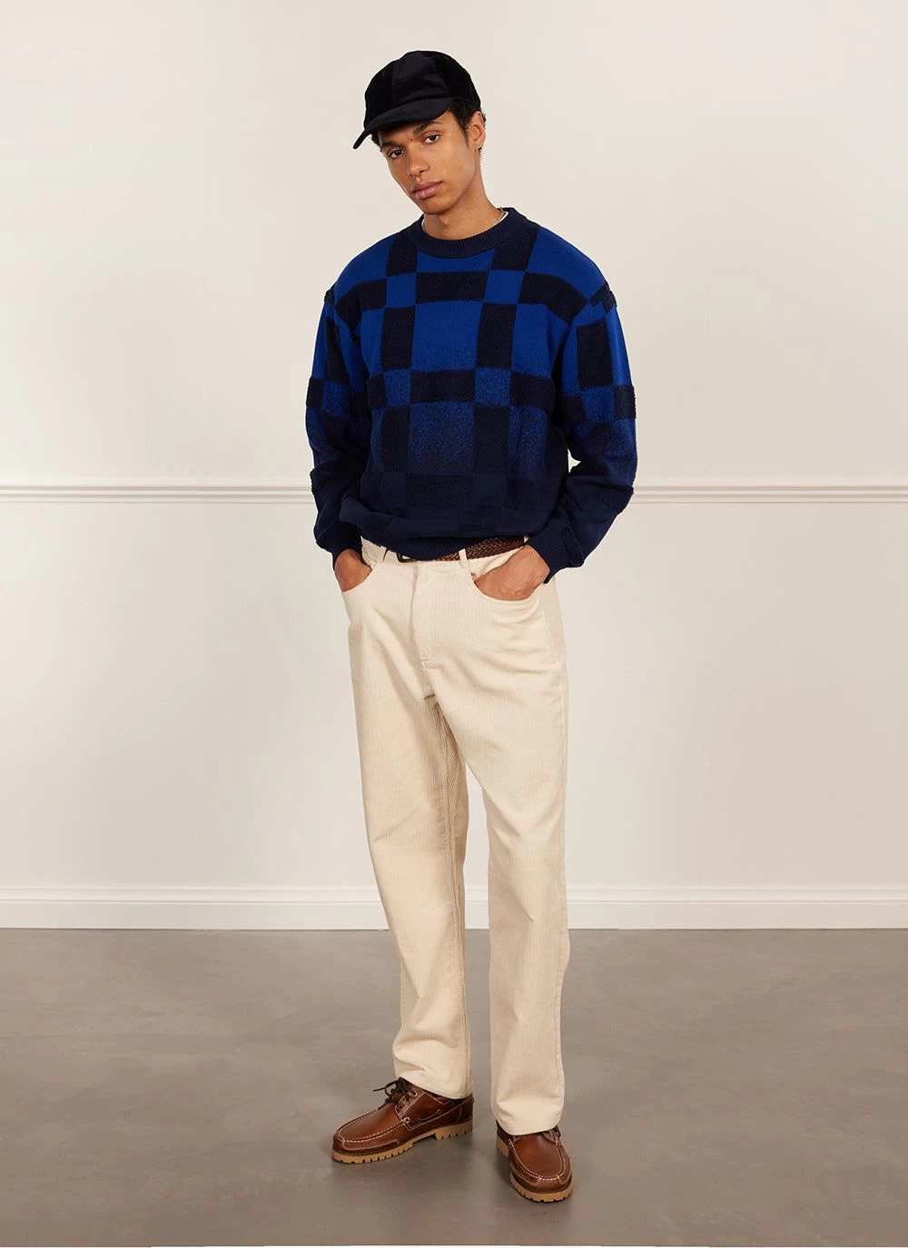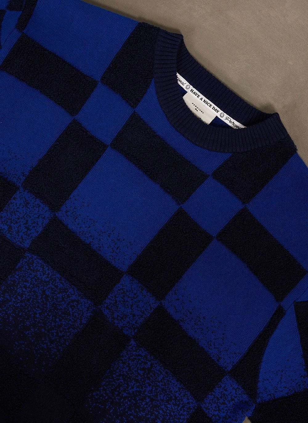 - Features: Intarsia checkerboard detail, couble bed jacquard gradient detail, crewneck with rib on cuff, hem & collar, custom back neck tape & back neck labelling