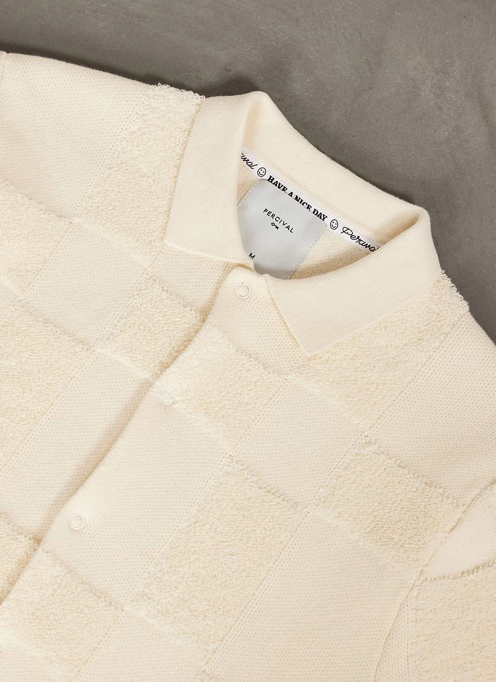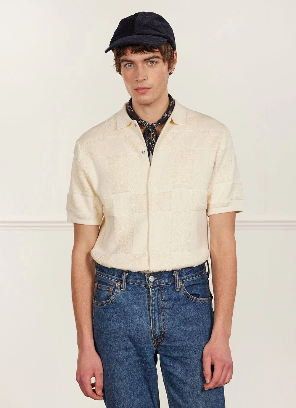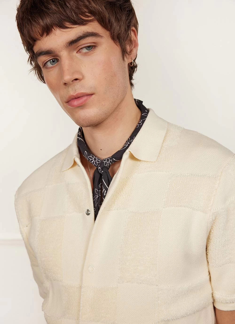 Intarsia is a knitting technique used to create patterns. This quality cotton knit shirt of tonal colours makes it look like the weave is almost inlaid in one another, the different weaves fit together like a jigsaw puzzle, a checkerboard or maybe even a bingo ticket. A smart summer knit, knitted in a classic shirt fit. Bingo.