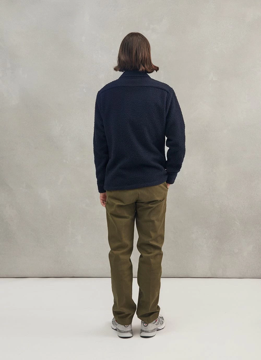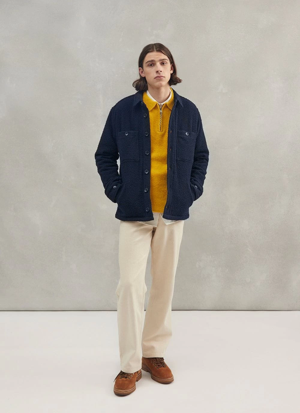 Percival workshirts, like overshirts but cut in a slightly wider fit and with different pocket details. A shirt for over another shirt. A shacket. A shirt come jacket. A mens overshirt or shirt for whomever wants to wear it, and wear it they may. This could be a hobby shirt, a DIY shirt, a workshirt, a WFH shirt. Cut in a beautiful Italian custom navy Casentino wool, (mouthful) then constructed in London & Portugal. Sounds like a deal.