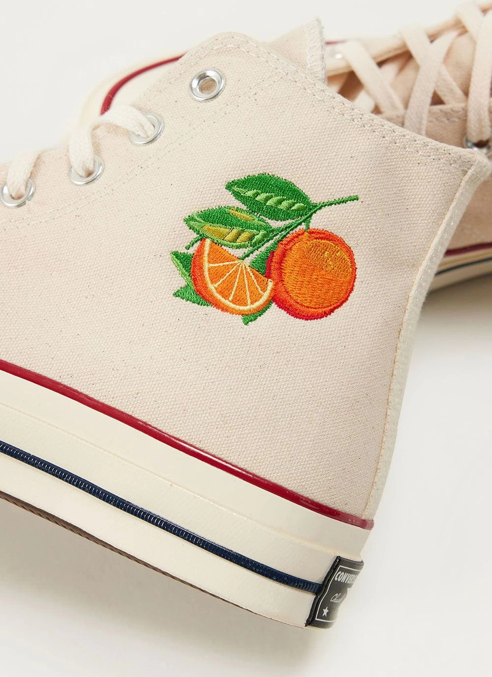 Put your best foot forward. The shoe universe meets the Percival embroidery needle. We’ve embroidered a very limited quantity of All Star Hi 70s with some of our greatest hits. Koi fish and Citrus of course. Heavy weight canvas with quality cotton embroidered in London.