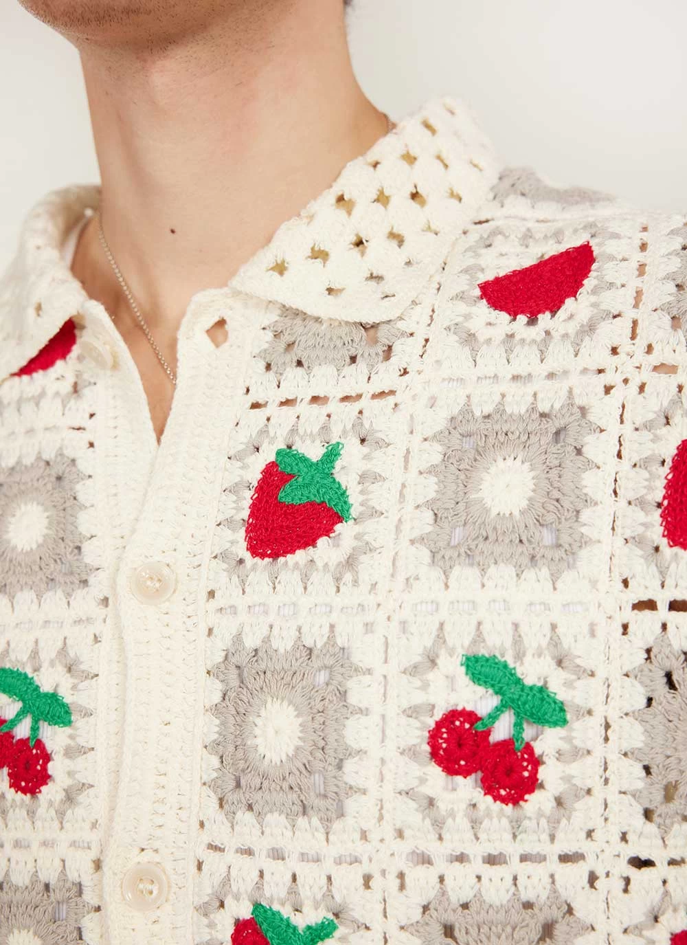 Part of the new Percival SS24 season, The Tuck Shop, the Fruit Crochet Shirt. More than part of your 5 a day, it’s more like a daily 10/10, that is how good you will look. Designed in London crochet knit shirt with citrus and berries, shirt fits true to size and is made in a limited quantity, a timeless piece with no best before, strawberry fields forever.