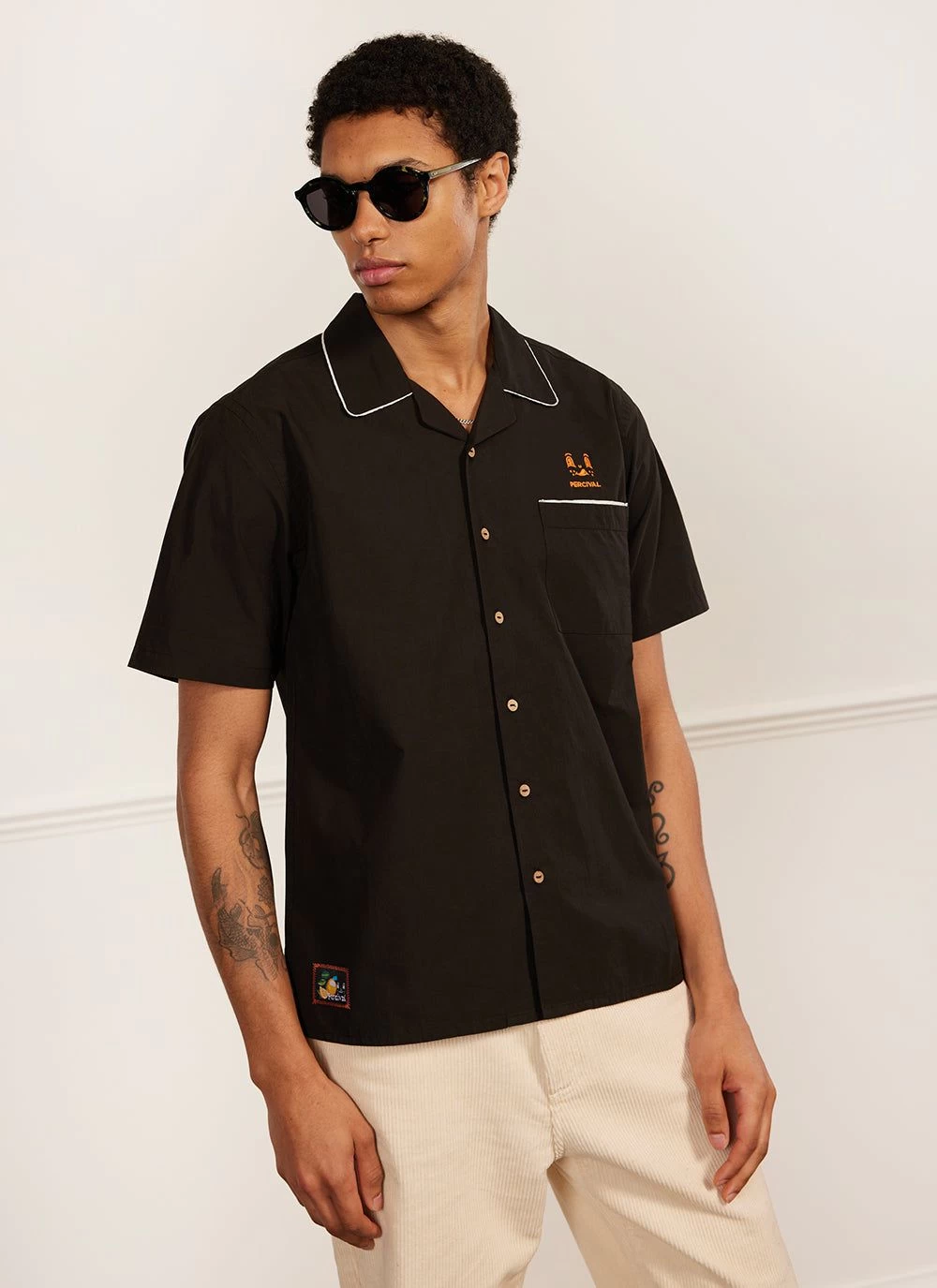 PerciCo Bowling team, throwing a few frames, now that’s what I call bowling. Teamster front and party out the back, check that embroidery. Have you seen a finer detailed summer shirt collection, no. Part of the Percival SS24 Tuck Shop collection, a collection referencing some of the finer things in life, snacks, sweets, gum drops, fruit sours, the lot. Cut in a summer weight cotton, wear open with vest and pleated linen trousers plus bowling shoe. Thanks.