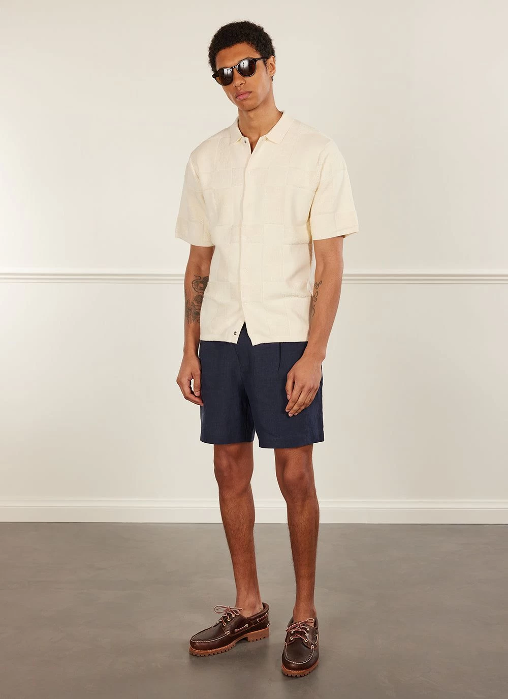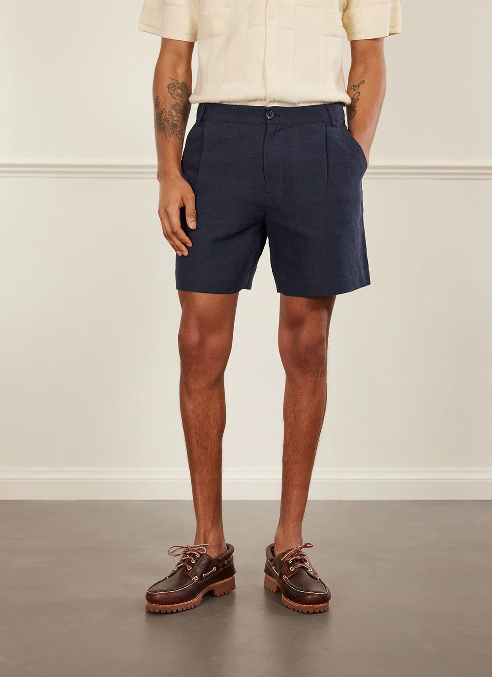 The fact is these shorts are a new smart shape for Percival with a pleated details, cut in a slightly wider fit and above the knee. Shorts can be paired with matching linen blazer or shirt, for a number one look. Or pair shorts with a tee, clean fresh, even go a little casual with a vest under open Percival summer shirt. Plenty of truths.