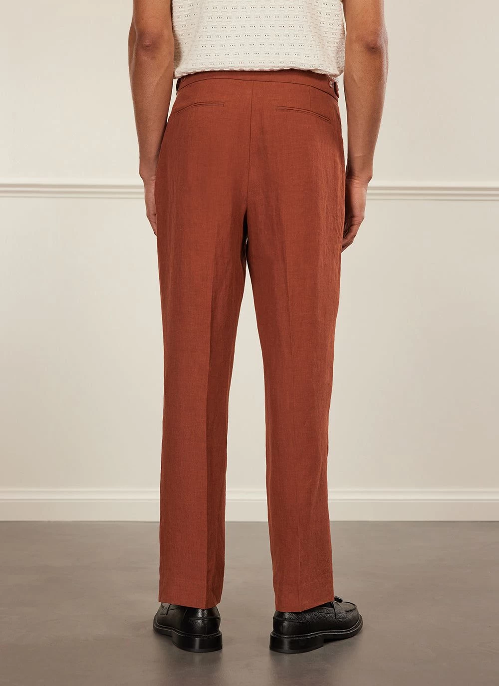 - Features: Men’s brown pleated trousers made from 100% Linen. With tailored details & construction for a looser, casual fit, these tailored suit trousers are ideal for weddings and smart dressing. Finished with a fixed waistband, front double pleat detail, side tab waistband adjusters with buttons, zip fly, back welt pockets and 4.5cm invisible hem turn up depth to allow for leg length for alteration.