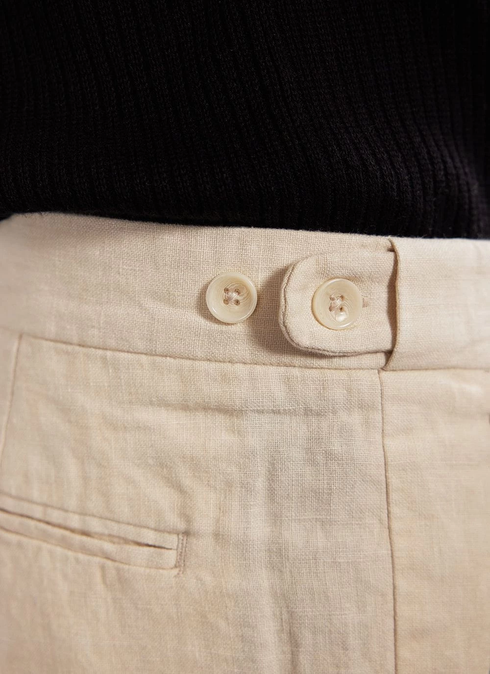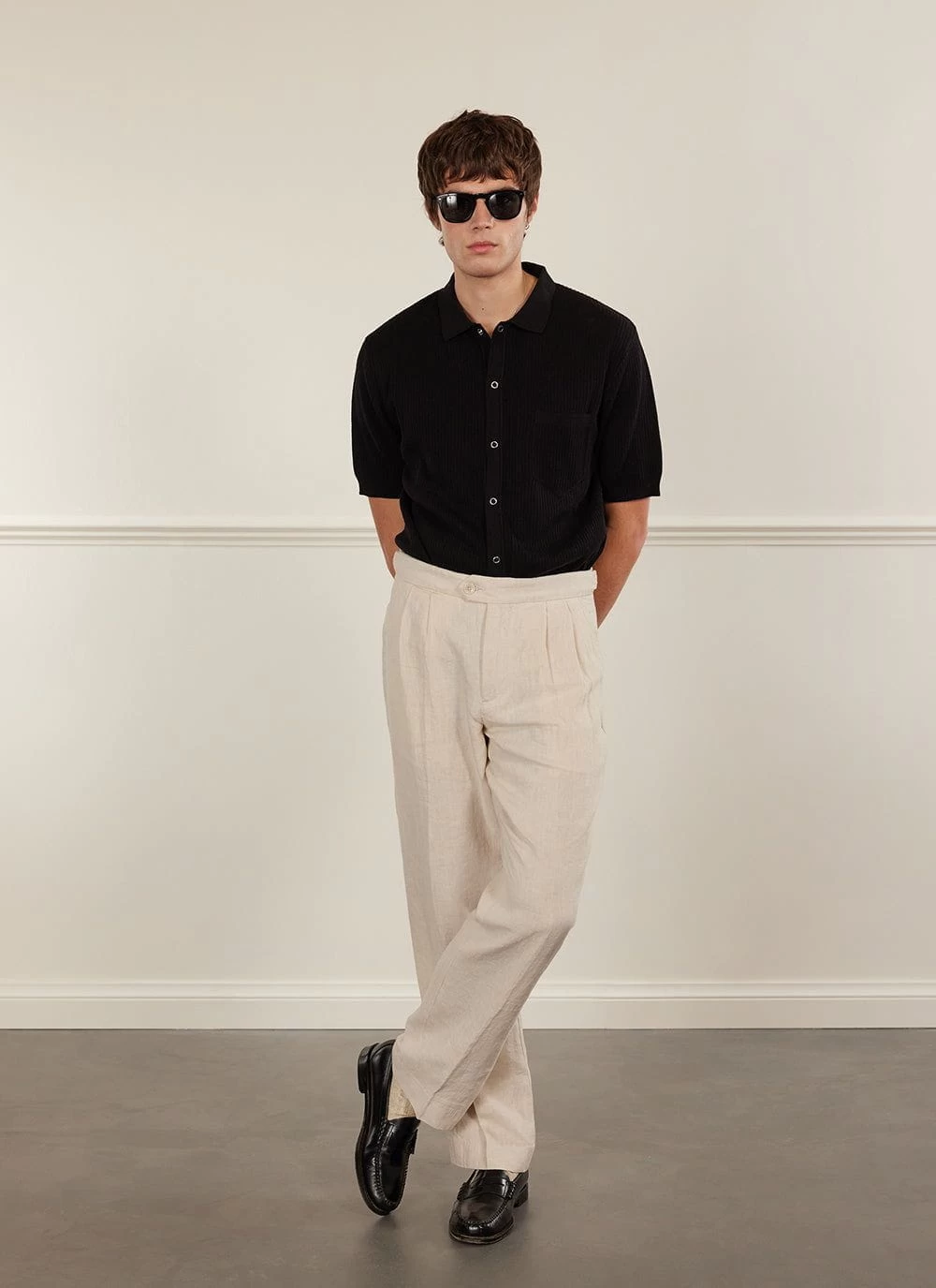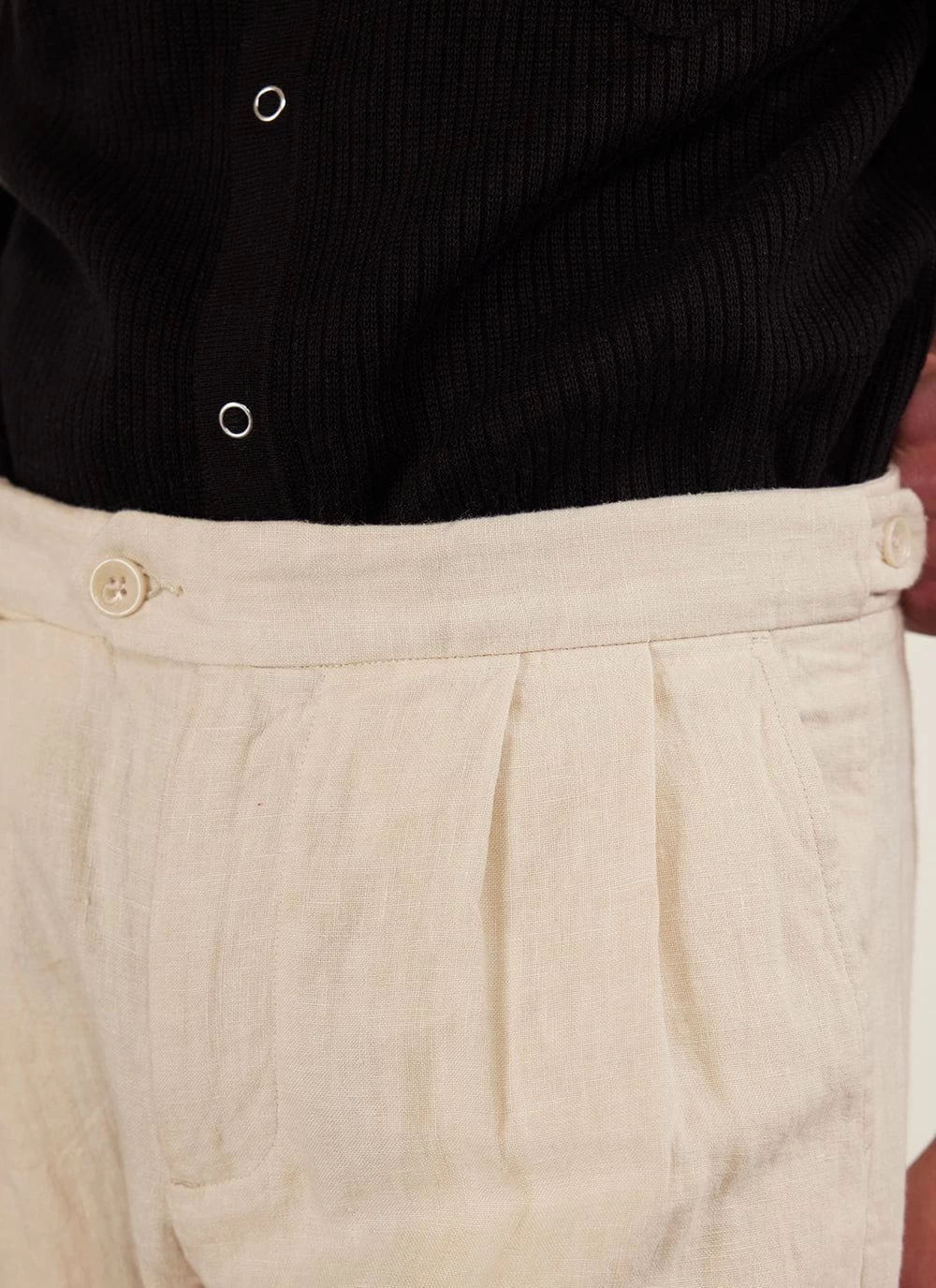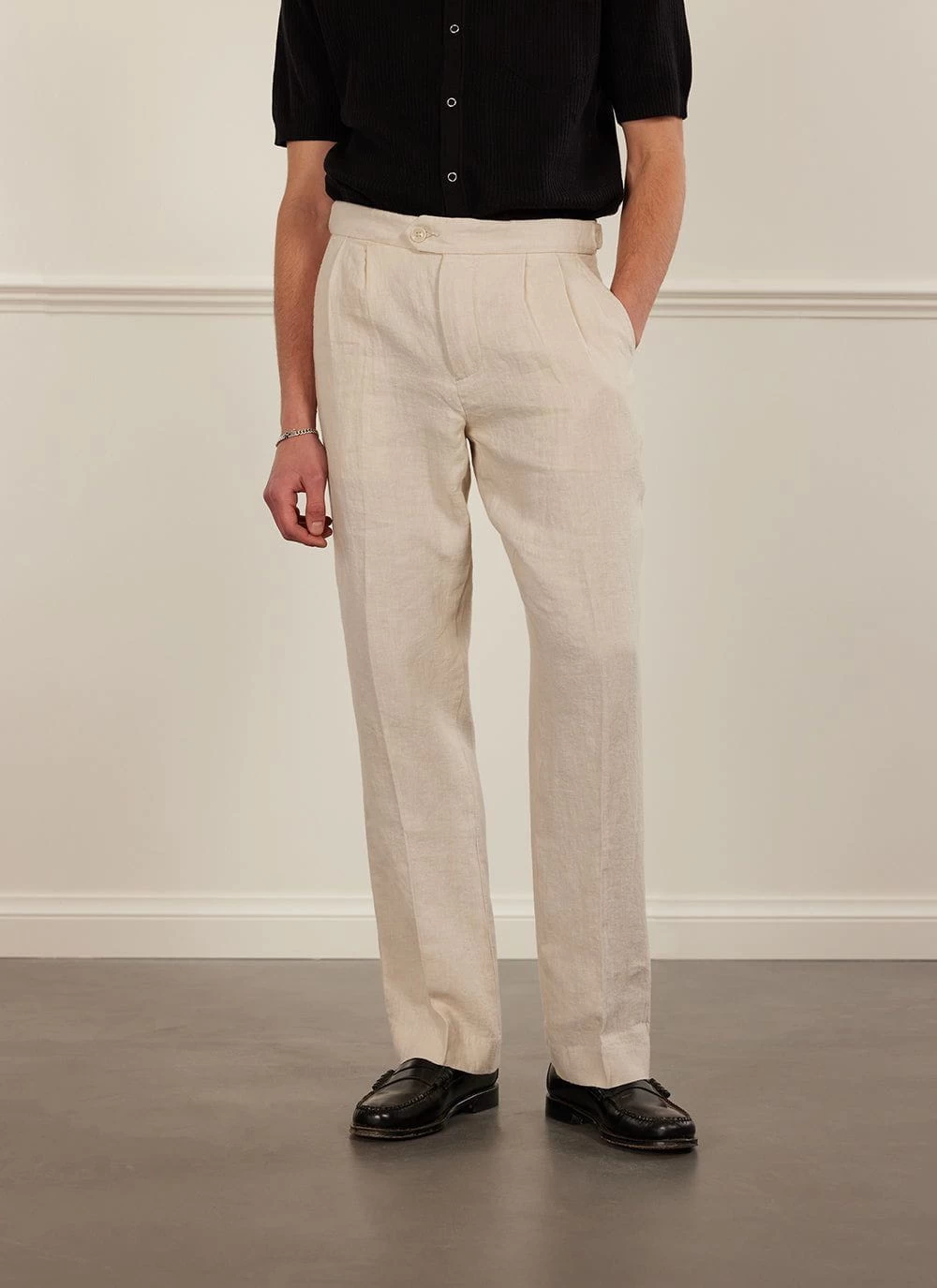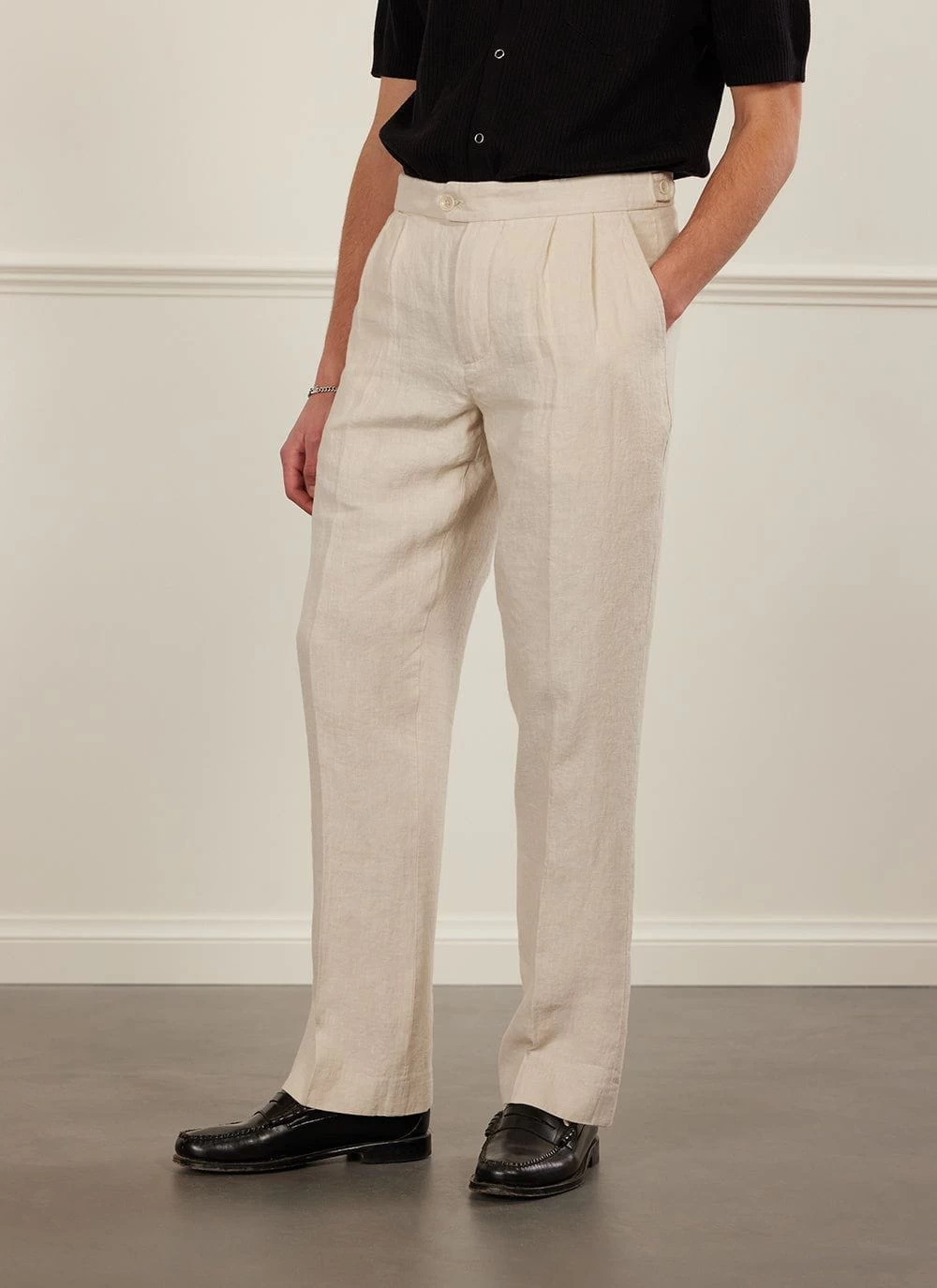 - Features: Men’s Pleated Trousers made from 100% Linen. With tailored details and in a loose casual fit, these Cream Linen Trousers are ideal for Summer Weddings and Smart Dressing. Finished with a fixed waistband, a front double pleat detail, side tab waistband adjusters with buttons, zip fly and back welt pockets. A 4.5cm invisible hem turn up depth also allows for leg length to be altered for personal preference.