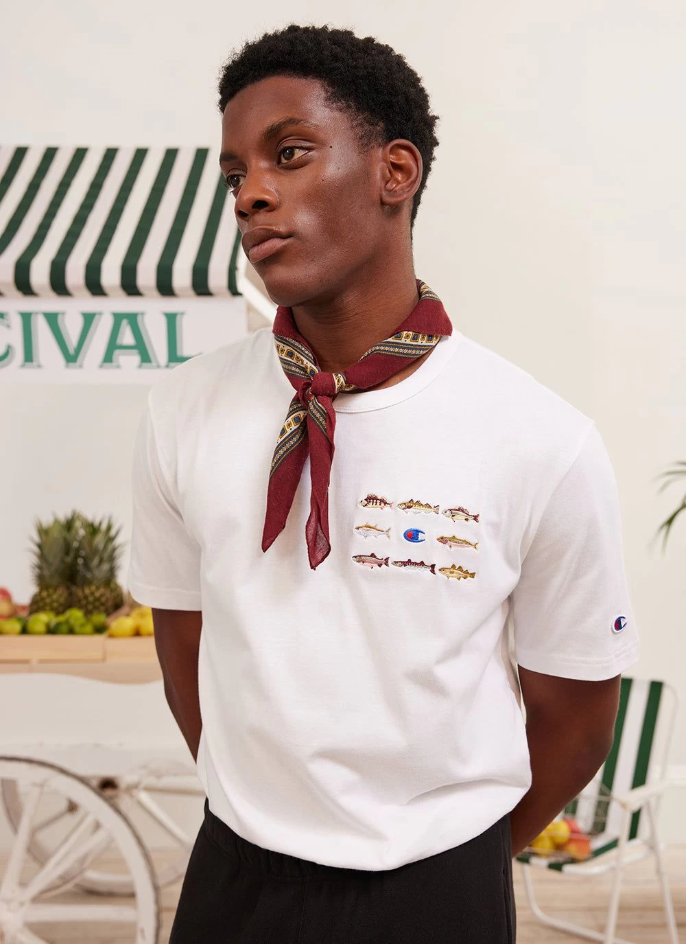 Part of the Champion and Percival autumn winter collection, featuring intricately hand drawn illustrations that we then digitise then embroider onto a quality Champion tees and sweats. The collection celebrates some of the things you may find at your local corner shop, (or perhaps not) and the fine design and detail that can go into some of the labelling and packaging of these items. Limited edition Percival x Champion t-shirt. A big fish from across the pond.
