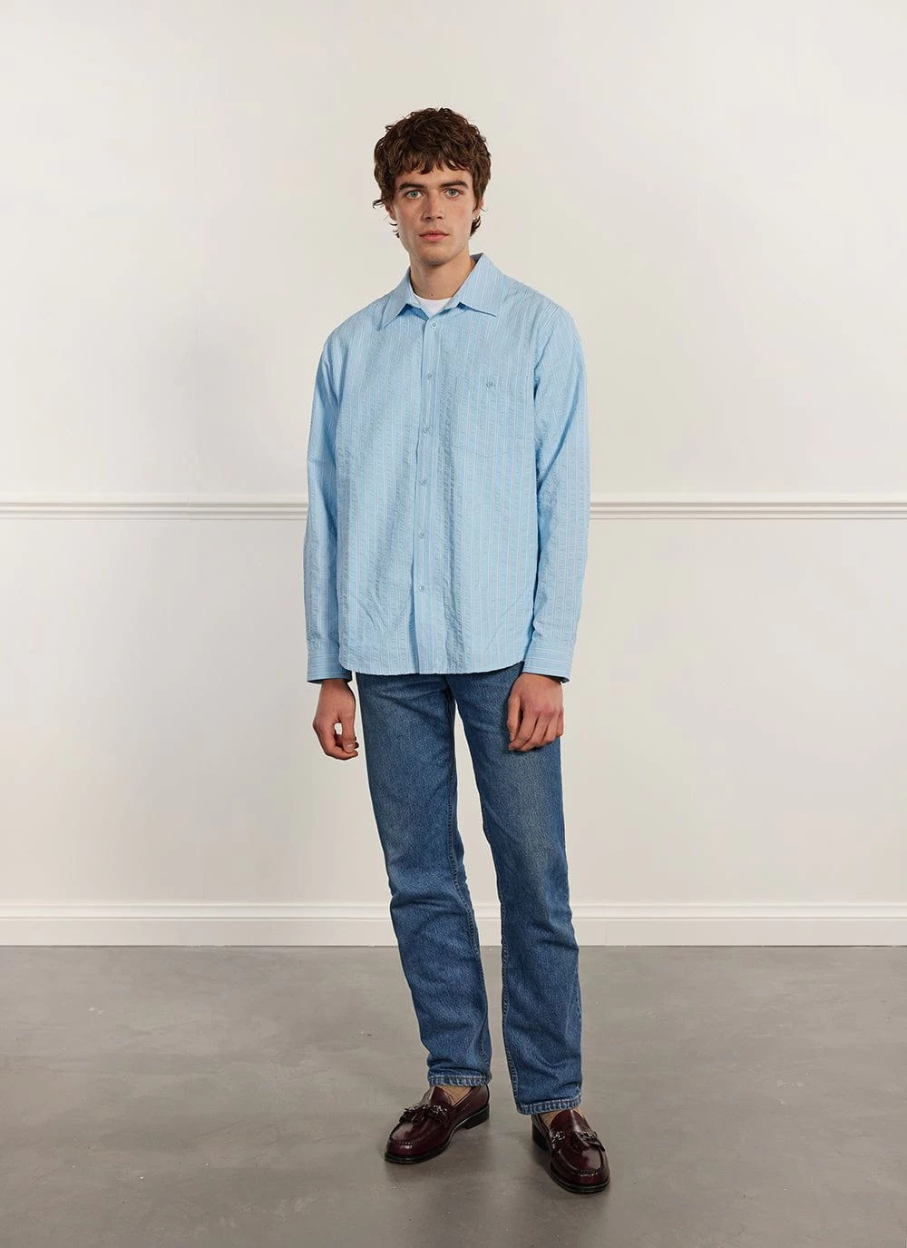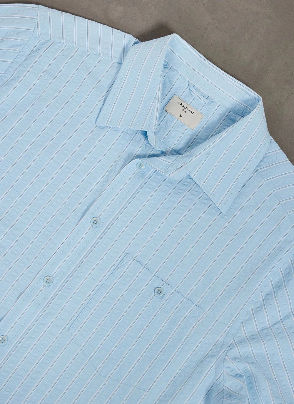 Percival oversized shirts, we’ve increased the size of our classic shirt for a slightly oversized fit, with a dropped shoulder and longer length front and back, slightly wider fit, it is oversized remember. Layer on top of Percival embroidered tees, or under winter warmer coats. A somewhat effortless throw on classic comfort, cut in a limited edition light blue tonal stripe. Don’t be blue.